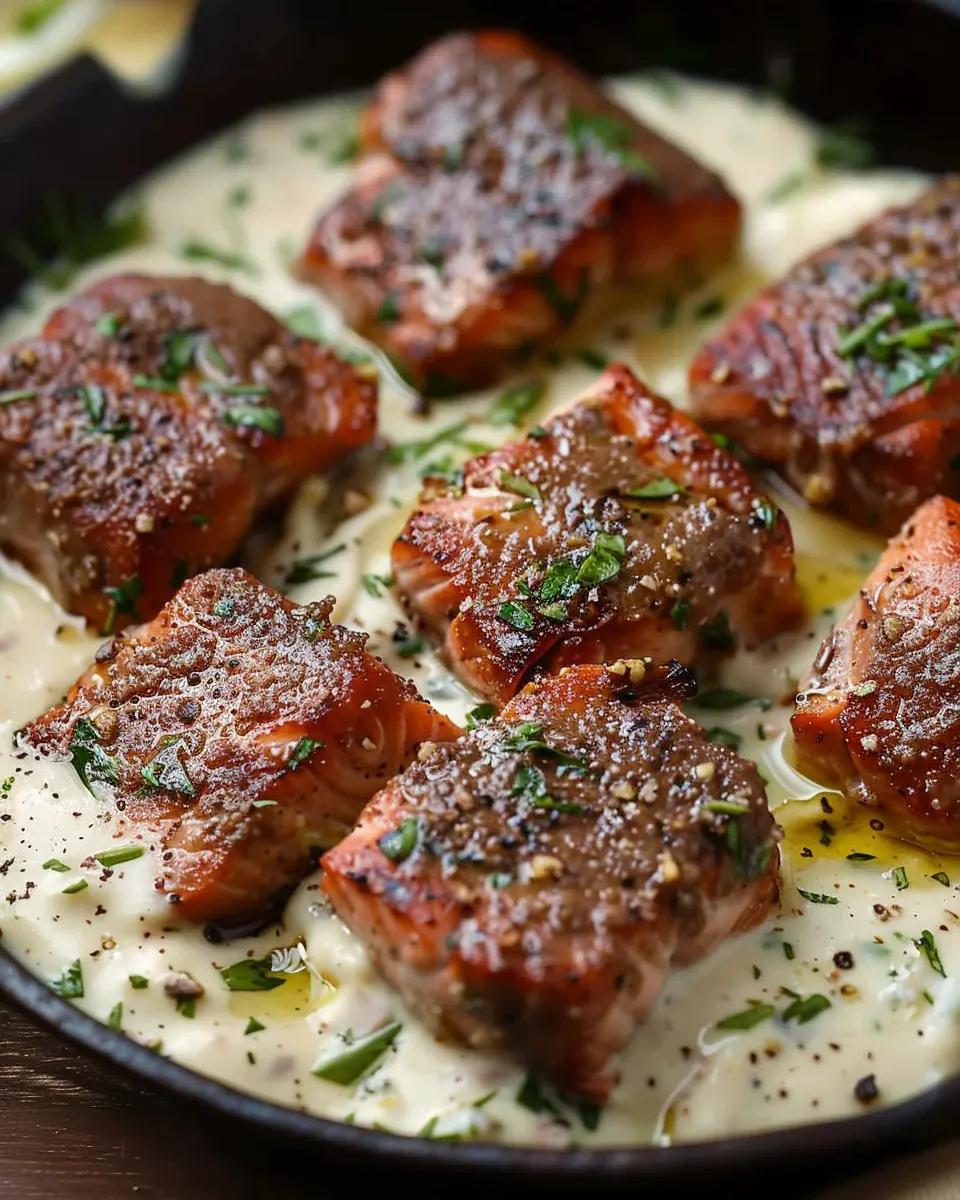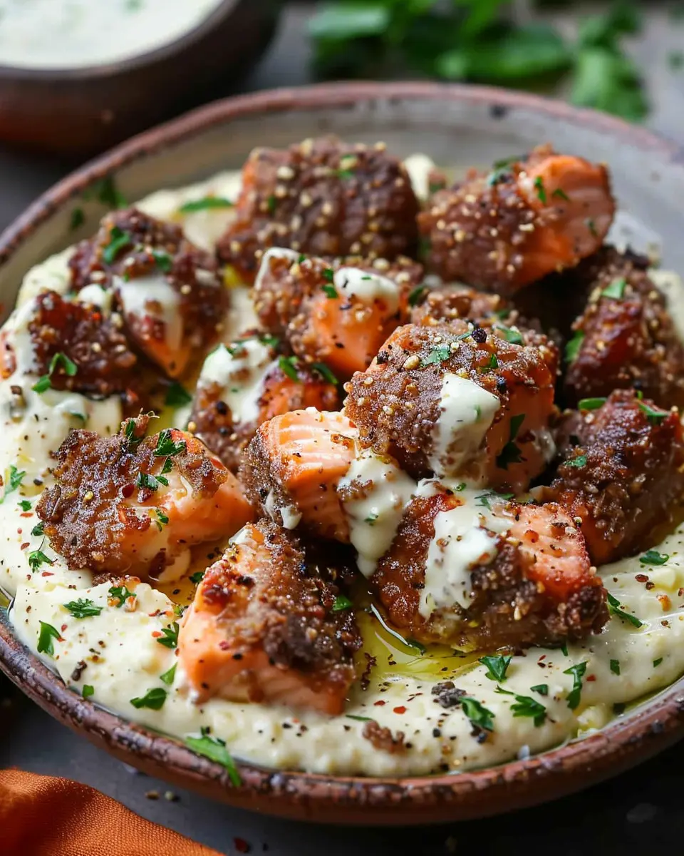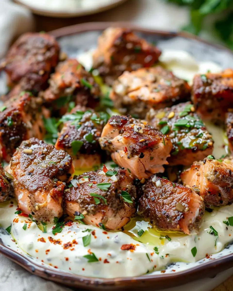 - Drizzle the garlic cream sauce over the salmon bites on a serving plate.