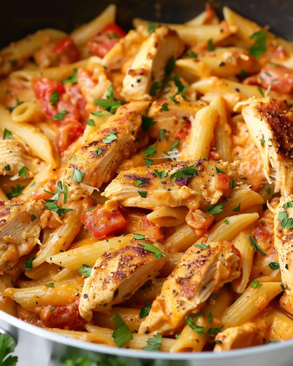 While the sauce simmers, cook your penne pasta according to package instructions. Drain it and then add it directly into the skillet with the sauce. Slice the cooked chicken into strips and sprinkle it over the pasta.