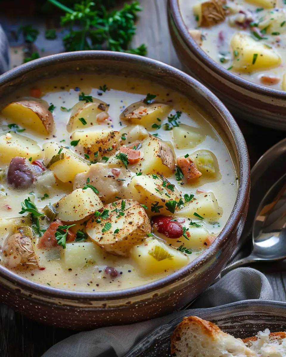 A deliciously creamy cajun potato soup that combines the smokiness of turkey bacon with savory chicken ham. Perfect for a cozy meal!