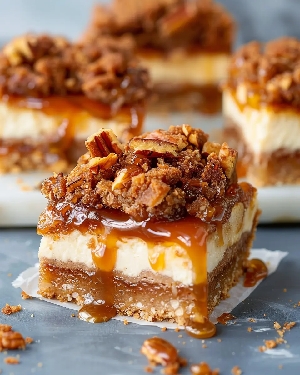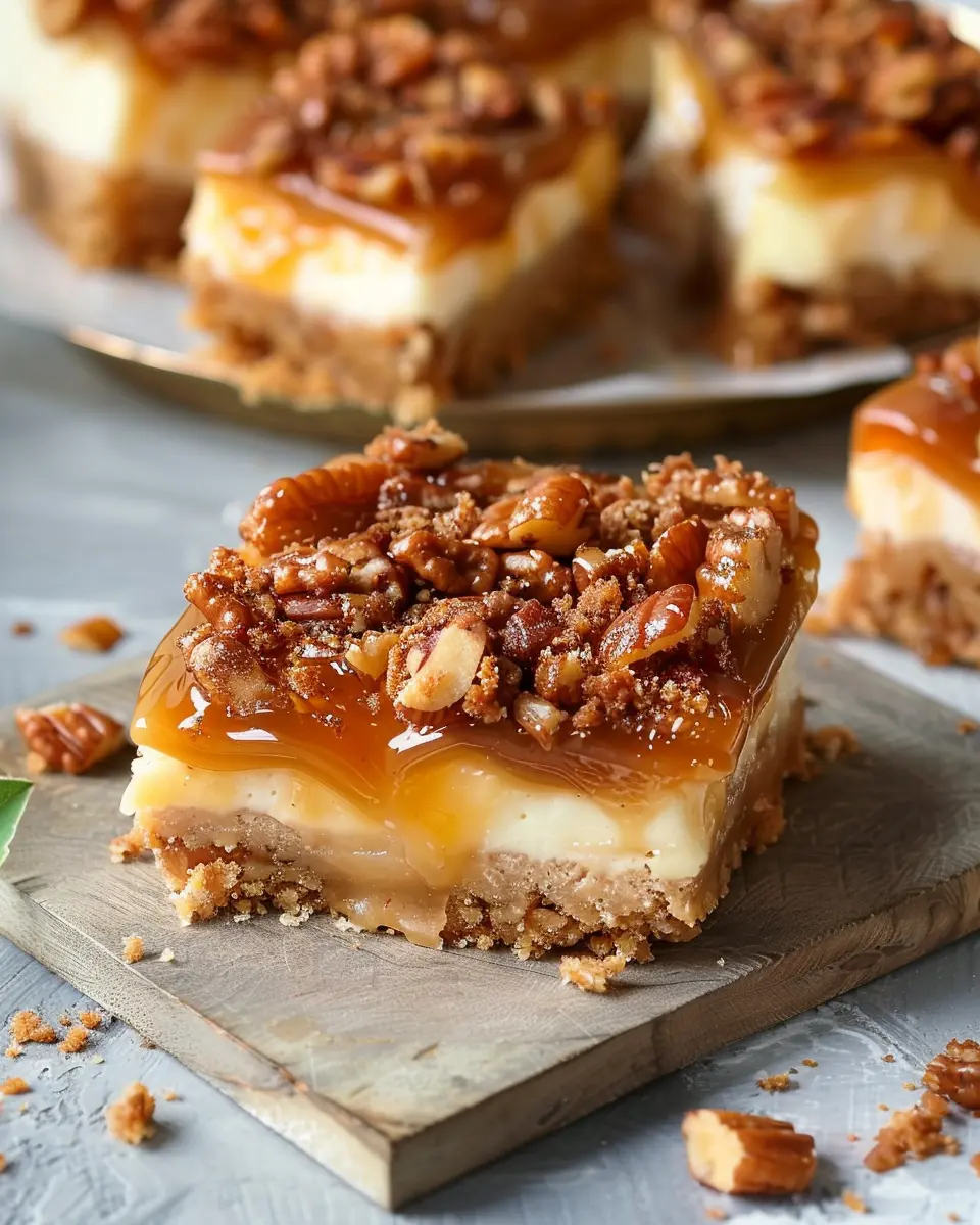 A rich and delicious dessert that combines the flavors of caramel, apple, and cheesecake in a perfectly baked bar.