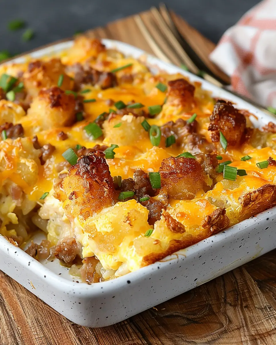 Tater Tot Breakfast Casserole with Turkey Bacon and Chicken Ham