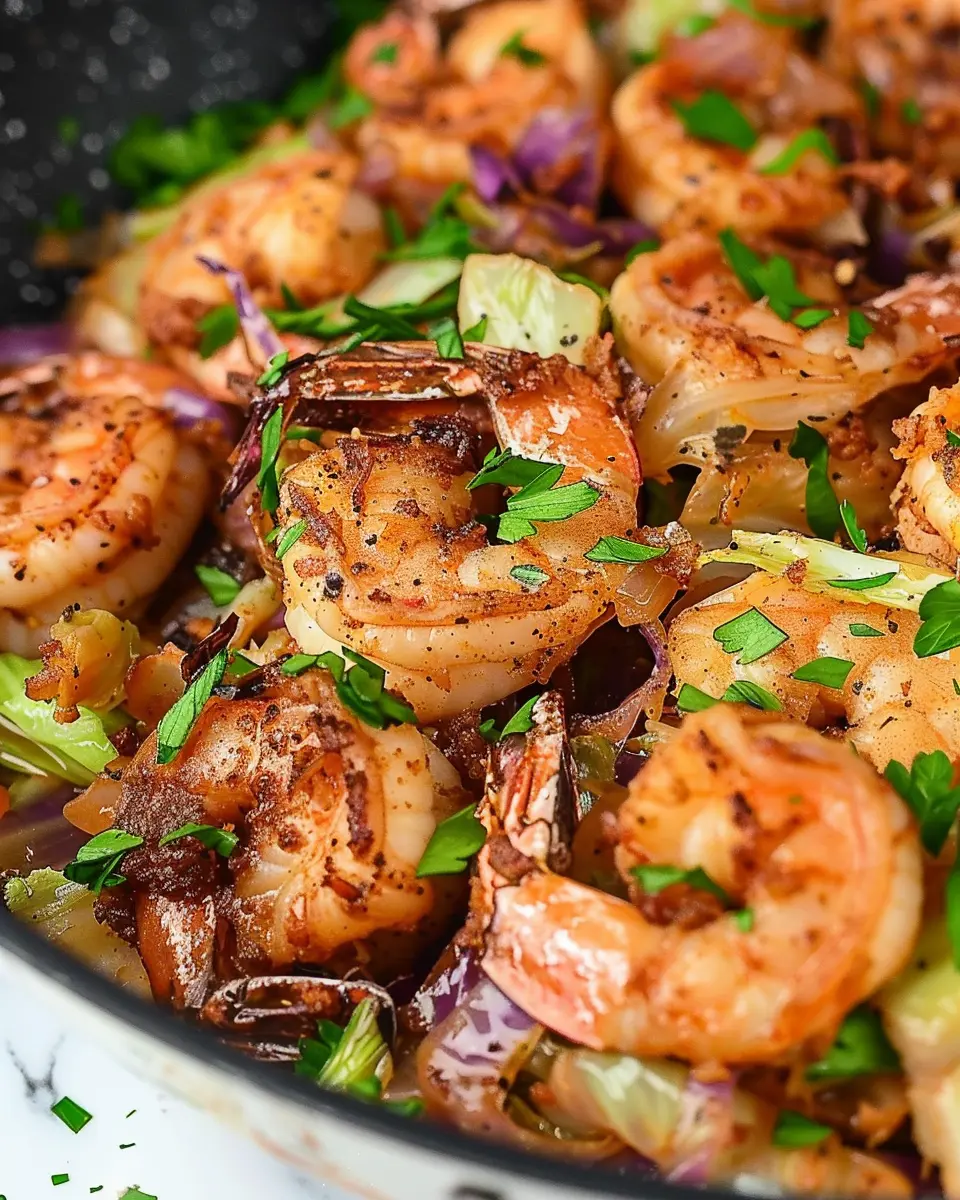 Keto Jerk Southern Fried Cabbage and Shrimp with Turkey Bacon