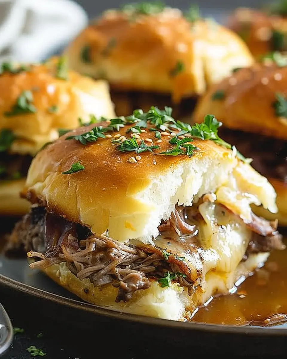French Dip Sliders: Juicy Turkey Bacon & Chicken Ham Delight