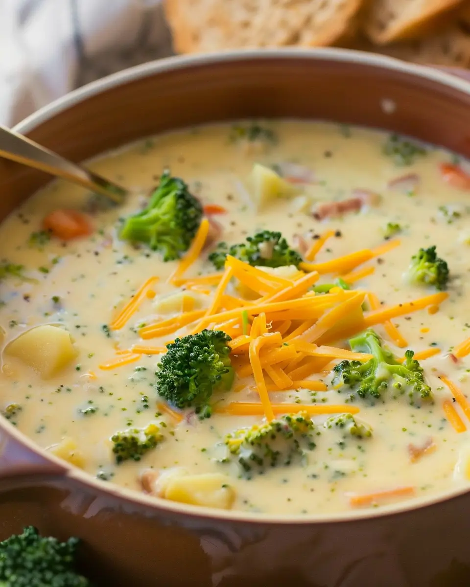 A creamy and comforting soup made with cheddar cheese, fresh broccoli, potatoes, and turkey bacon, perfect for chilly days.