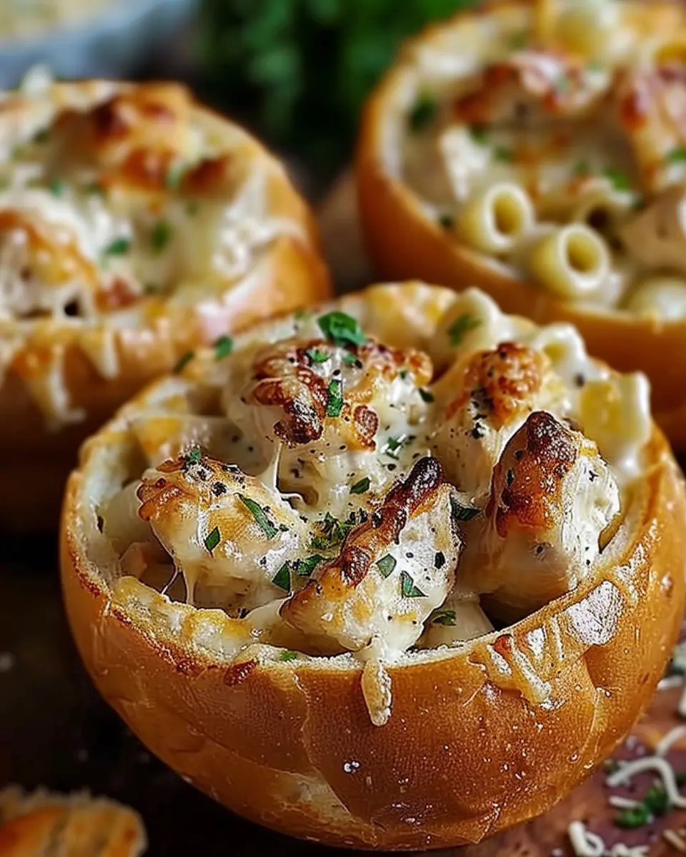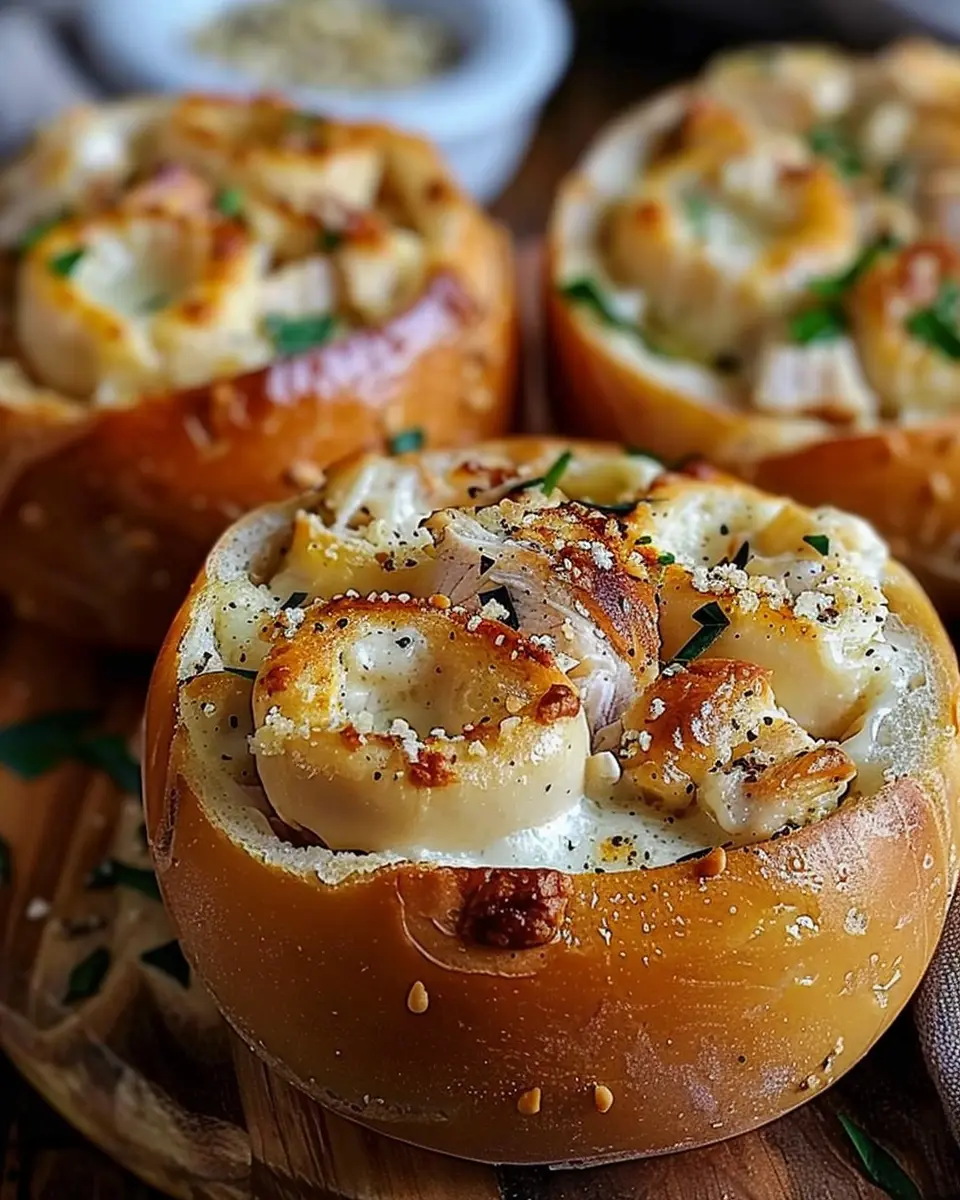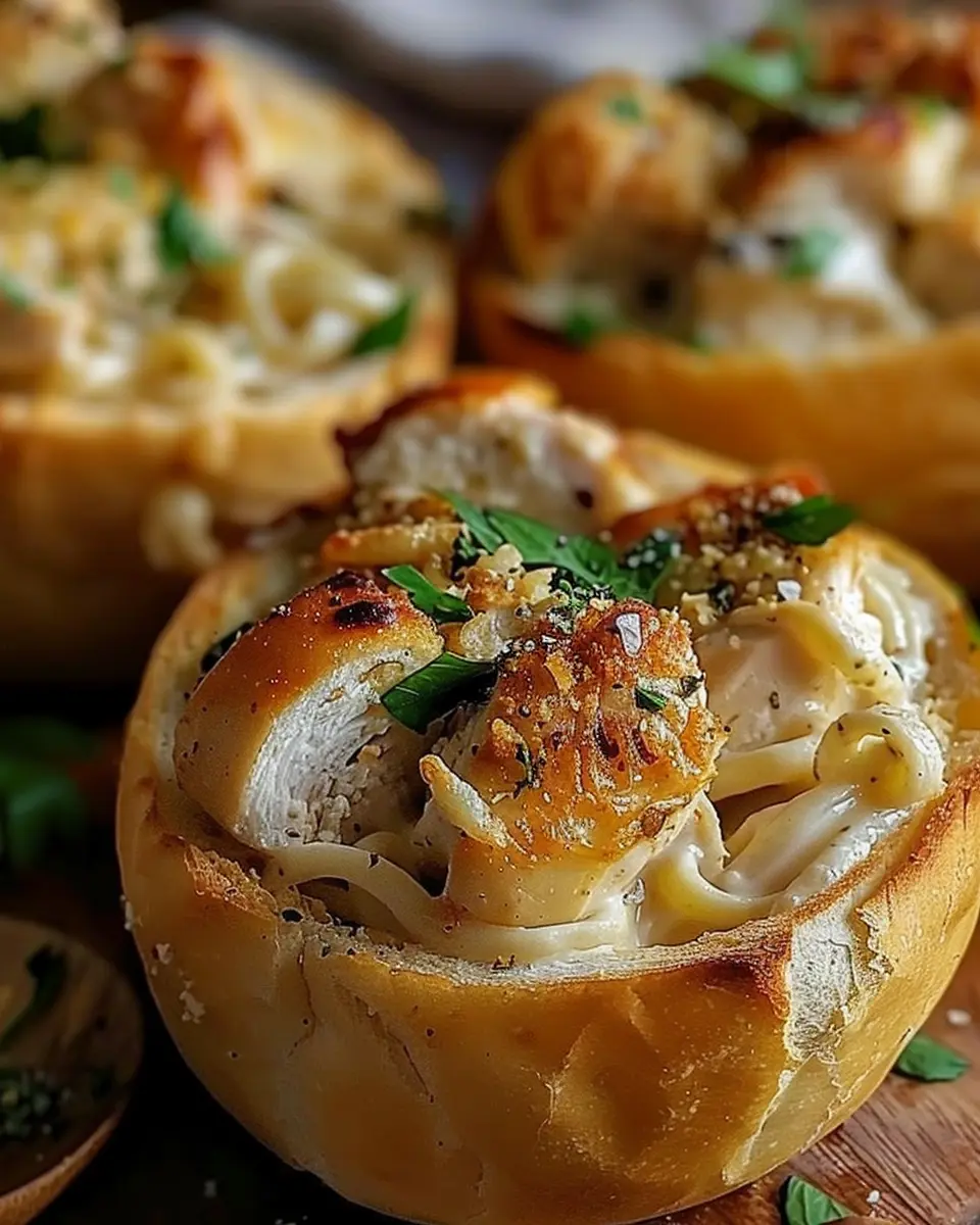 Enjoy your culinary adventure with these delicious chicken alfredo garlic bread bowls!