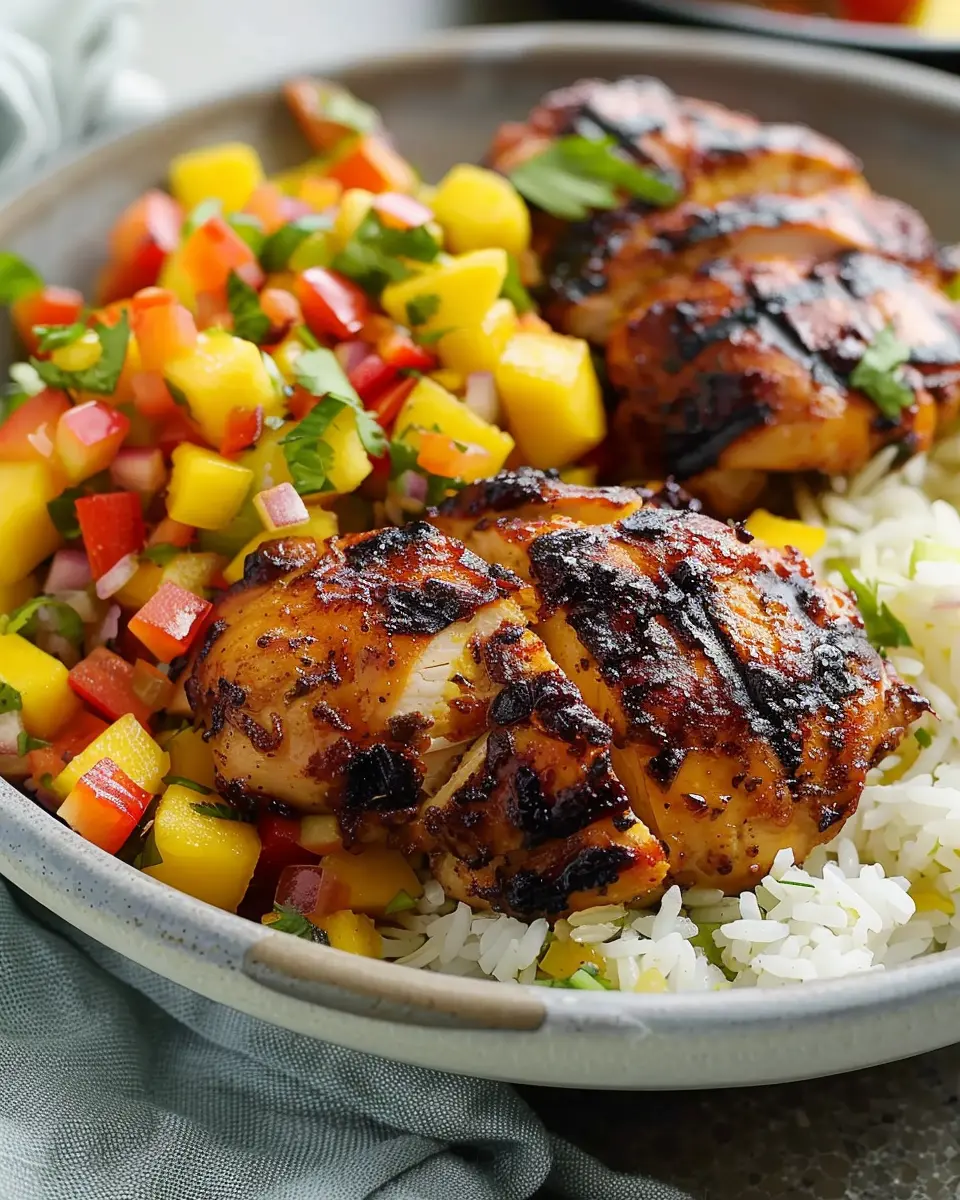 - Serve chicken with rice and top with mango salsa.