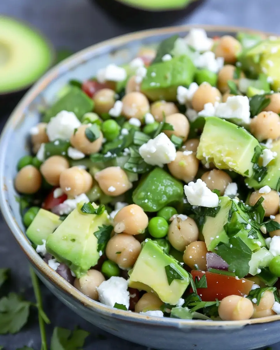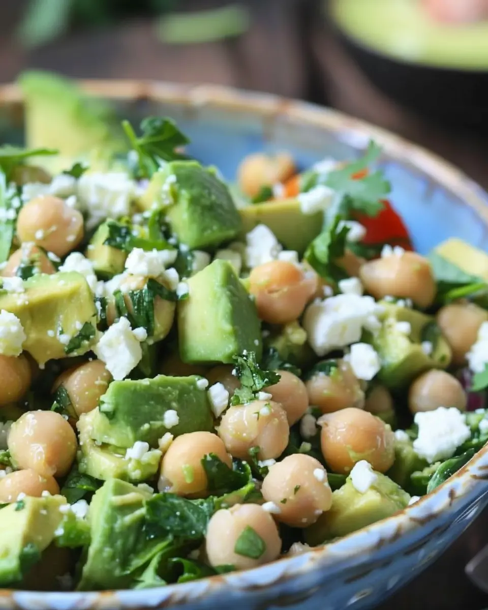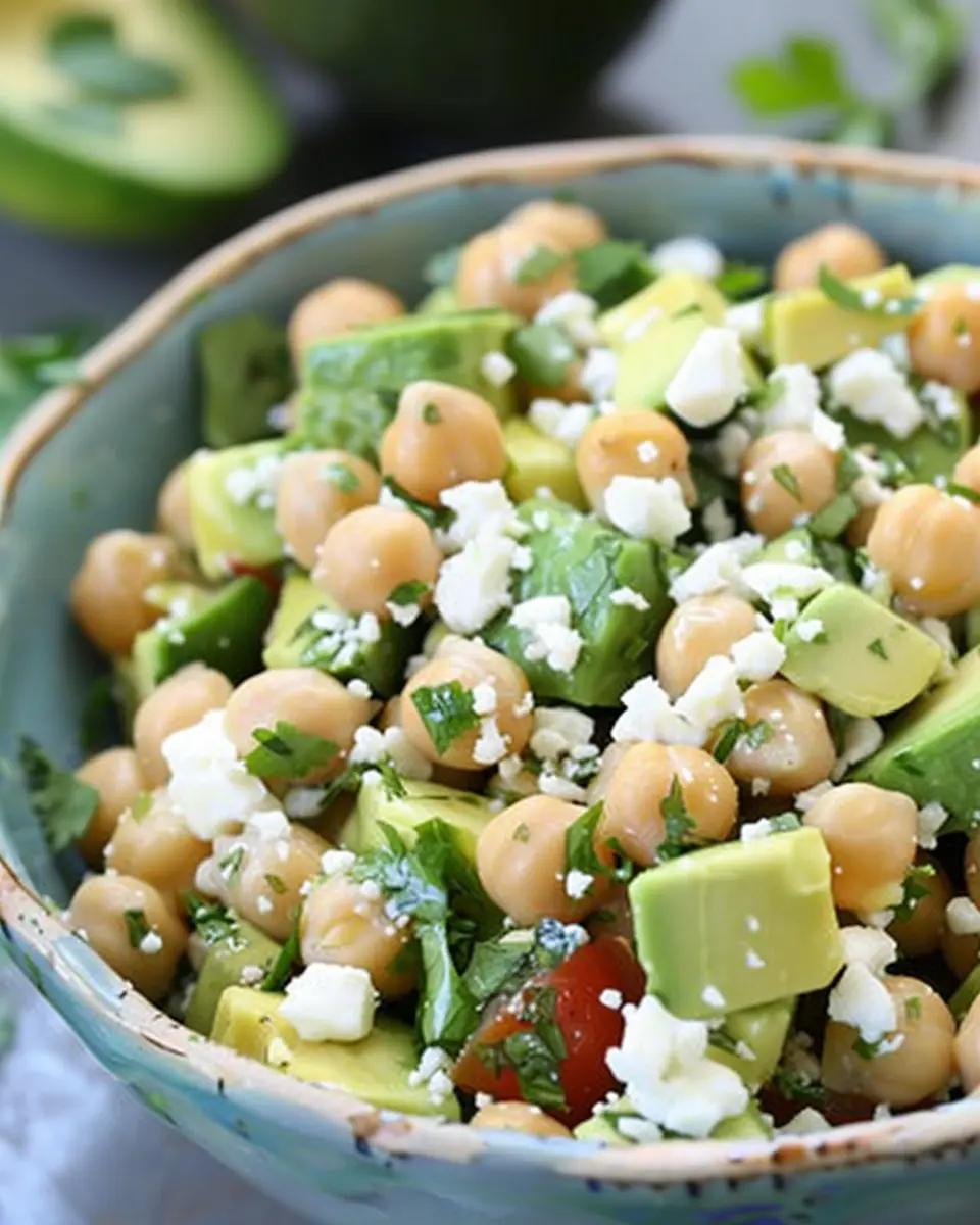 A refreshing and nutritious salad combining chickpeas, creamy avocado, and crumbled feta cheese.
