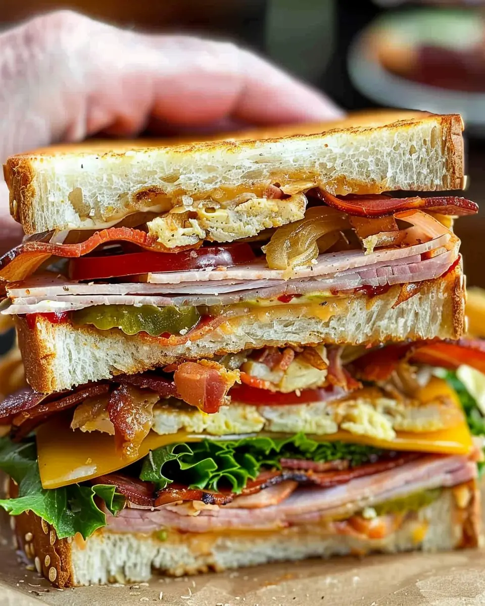 When making your cowboy club sandwich, the choice of bread can elevate your entire experience. Look for breads with a hearty texture, like sourdough or whole grain, which not only support the hefty layers of fillings but also add a lovely depth of flavor. Don't shy away from toasting your bread until it’s golden and crispy—this adds a wonderful crunch that complements the textures of your turkey bacon and chicken ham beautifully. If you’re feeling adventurous, consider using a rustic ciabatta for a unique twist!