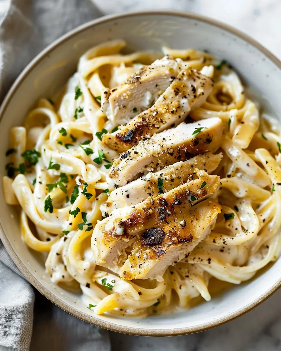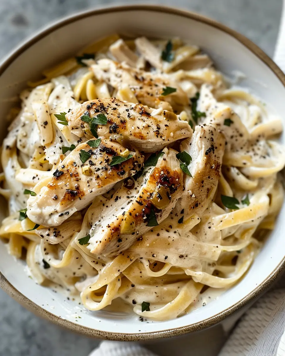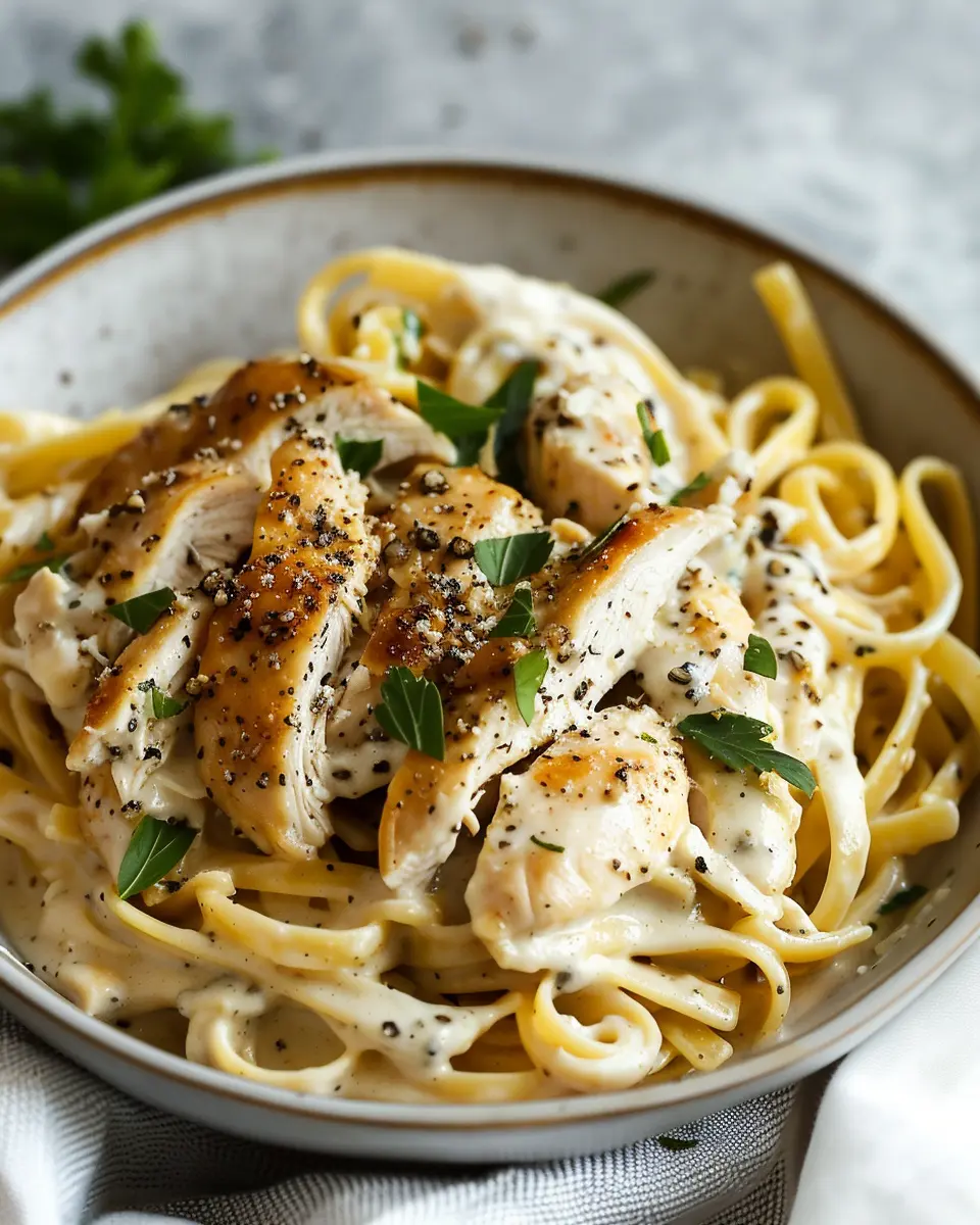 A delicious and creamy pasta dish featuring chicken and turkey bacon, perfect for a weeknight dinner.