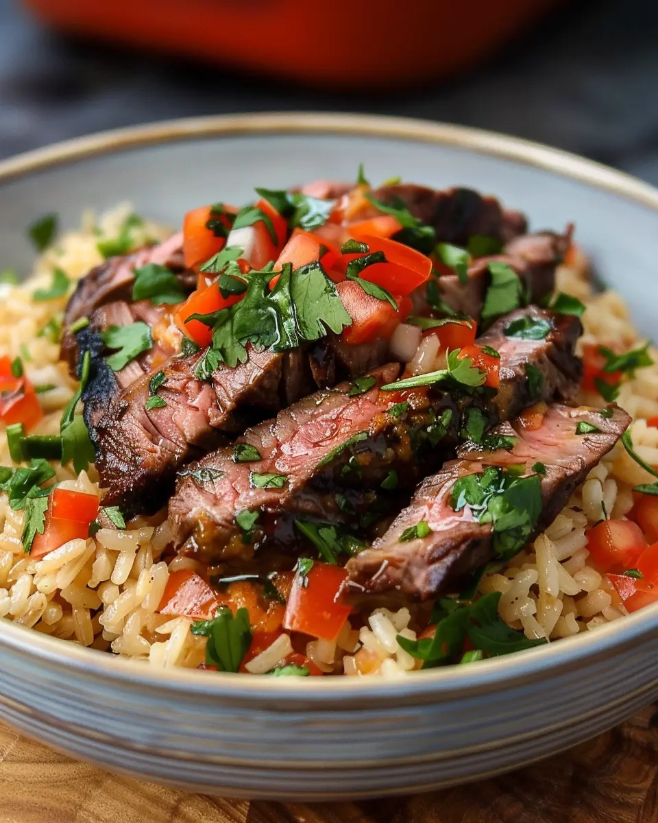 This Creamy Queso Rice with Juicy Steak Strips recipe is perfect for a cozy dinner, combining rich flavors with comforting textures.