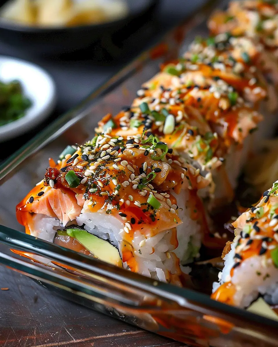 Serve: Once baked, let it cool for a few minutes before serving. You can garnish with more sliced green onions, nori strips, or sesame seeds for that authentic sushi experience.
