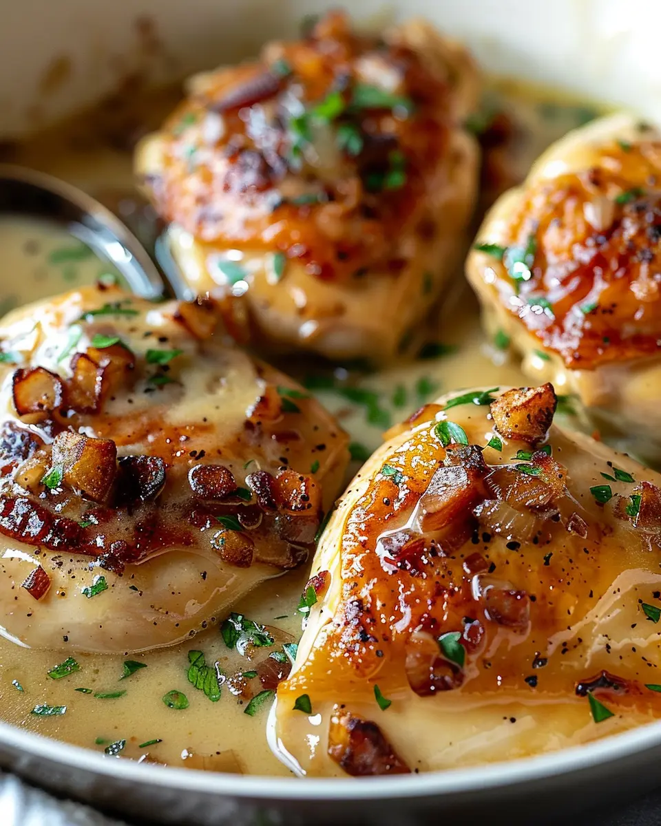 A delicious and easy stovetop smothered chicken recipe featuring turkey bacon and a creamy sauce.
