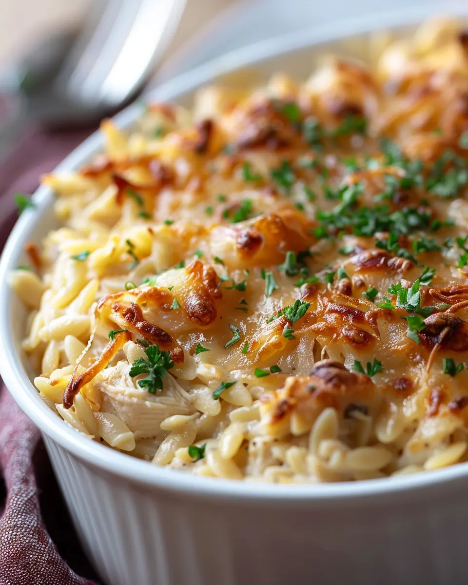 PrintFrench Onion Chicken Orzo Casserole: A Cozy Comfort Meal