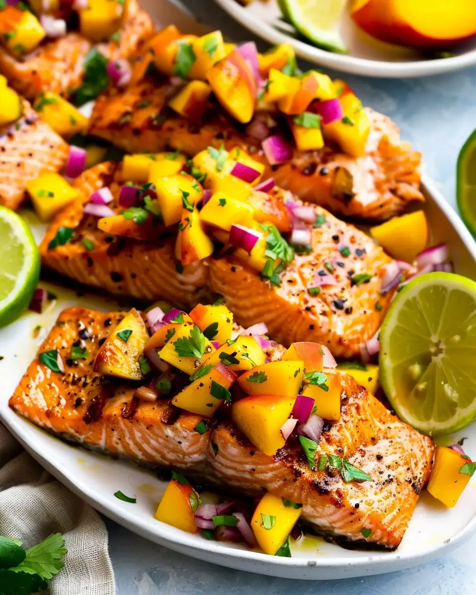 Enjoy a refreshing and flavorful grilled salmon paired with a vibrant mango peach salsa, perfect for summer gatherings.