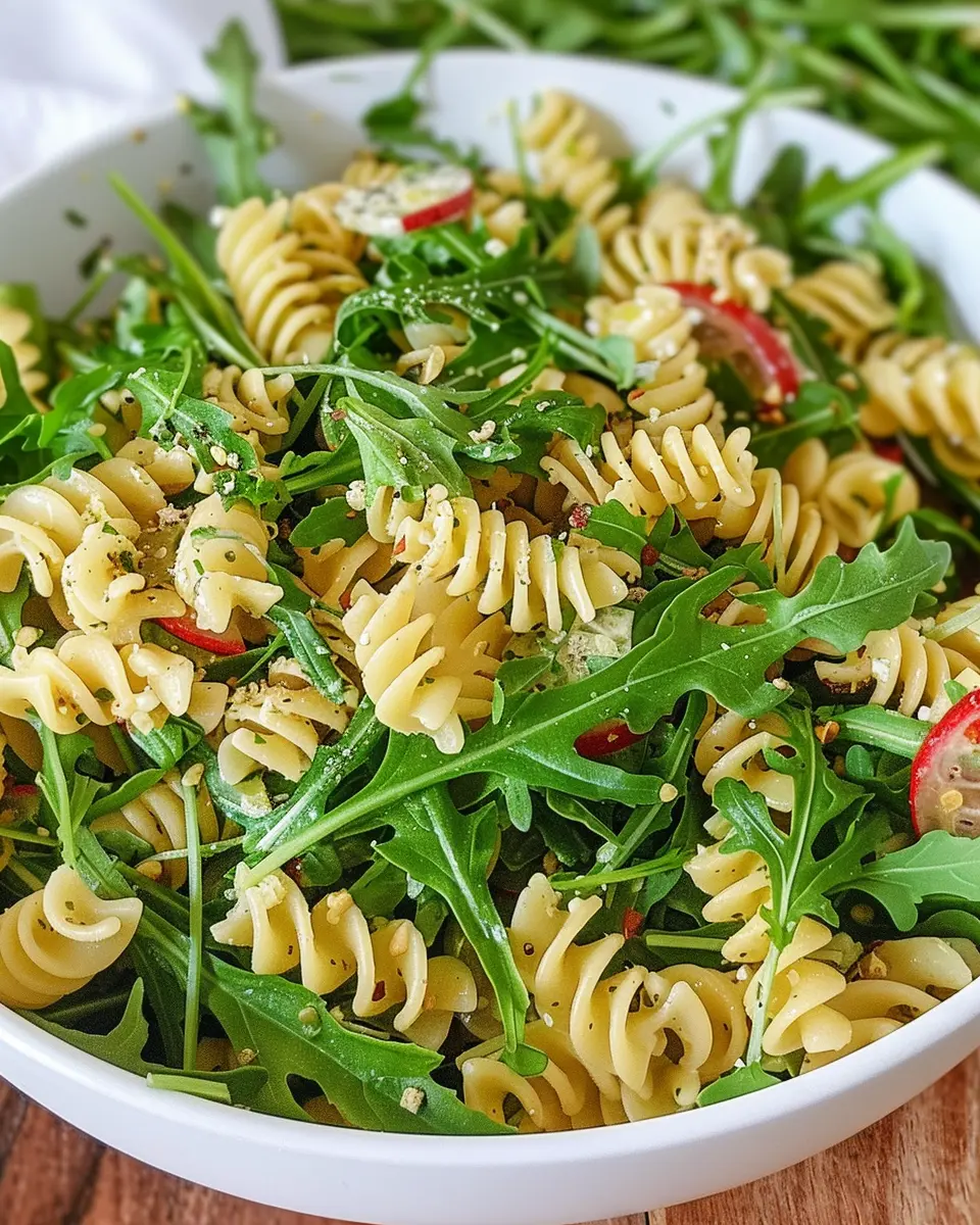 1. Mix in a Large Bowl: In a large salad bowl, combine the cooled pasta, arugula, and other ingredients. This is your chance to get creative. You can also add nuts for crunch—pine nuts or walnuts work great!