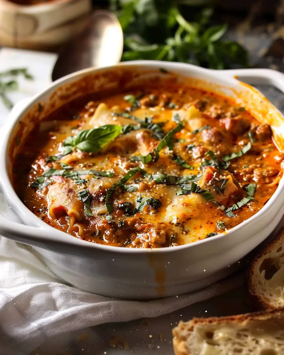 A warm and comforting soup that combines the flavors of lasagna in a creamy broth, perfect for cozy nights.