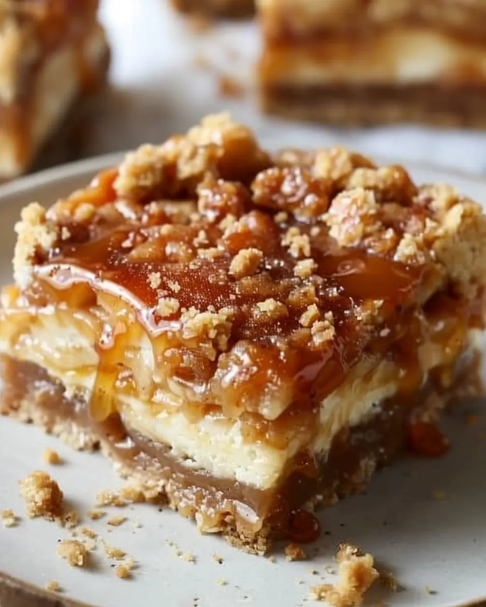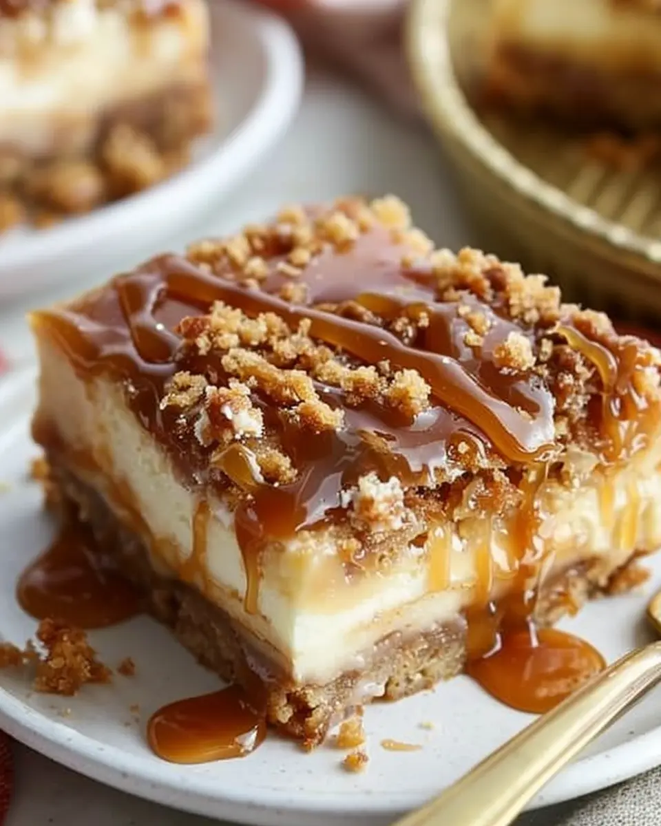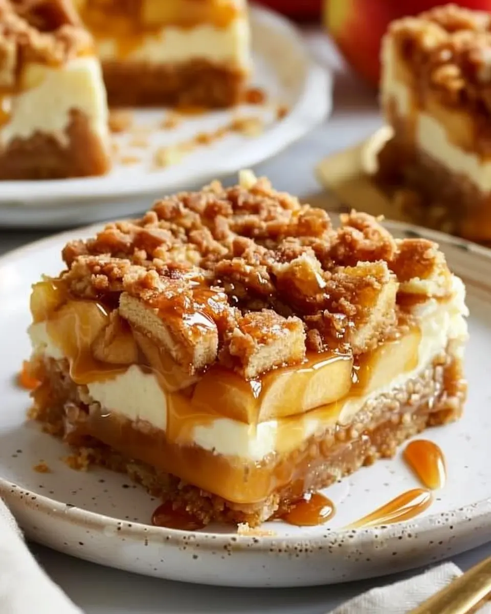 Delight in the rich combination of salted caramel, apple, and creamy cheesecake in these delicious bars.
