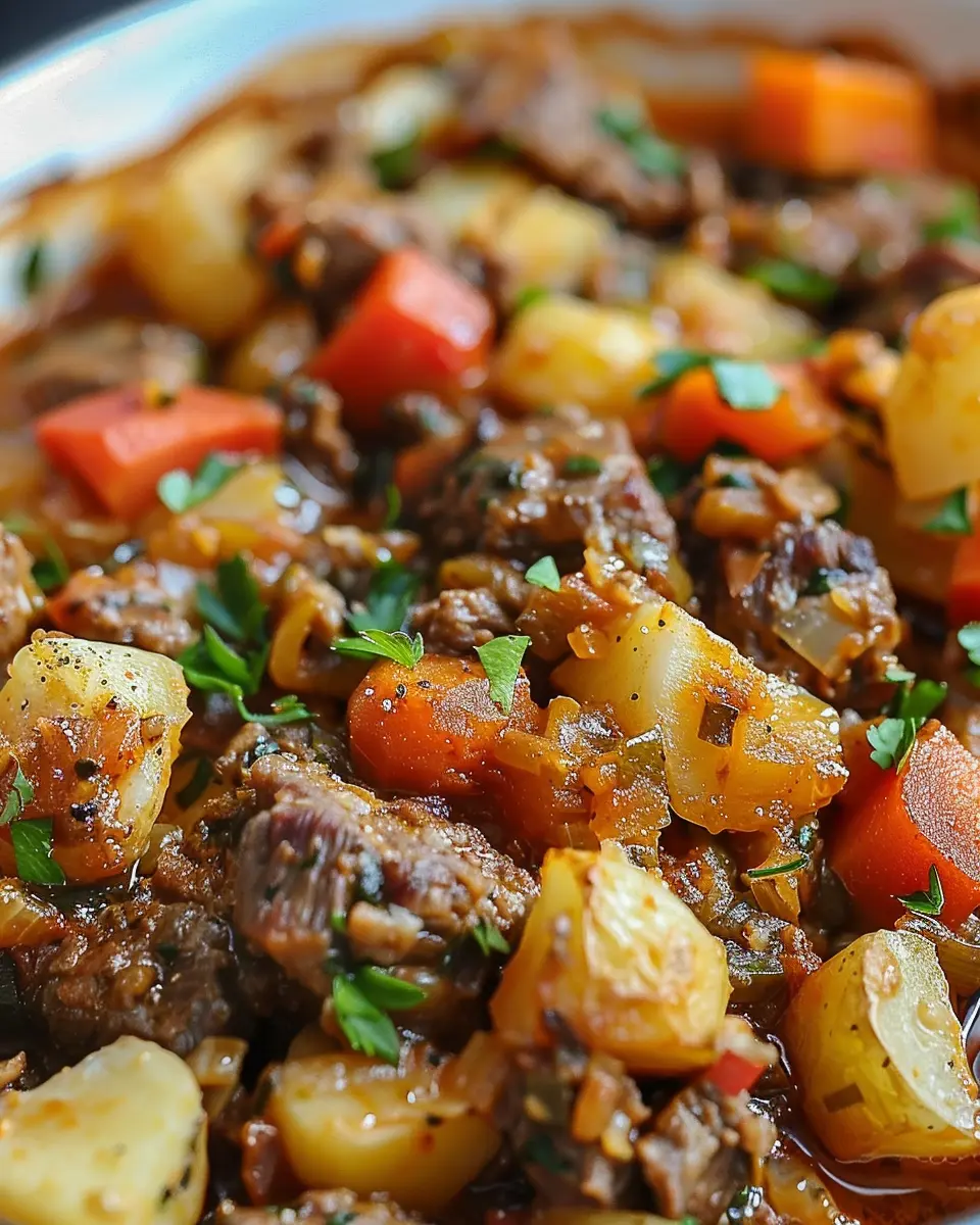 A hearty and delicious casserole that combines tender beef with nutritious vegetables in a savory sauce, perfect for family dinners.