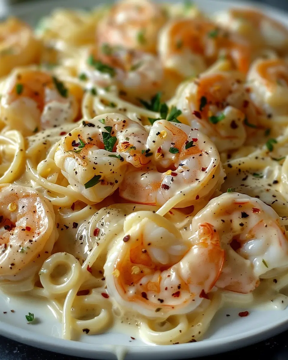 A Spicy Shrimp Alfredo with Red Pepper Flakes