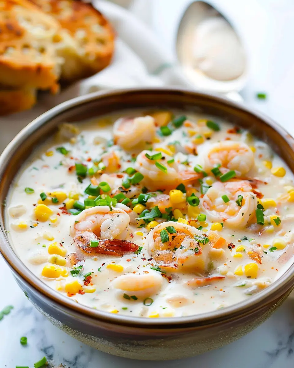Enjoy a warm and comforting bowl of Shrimp Corn Chowder, featuring a creamy base and the rich taste of turkey bacon.