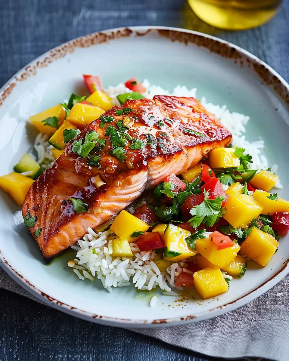 A delicious teriyaki salmon paired with a fresh mango salsa, perfect for family dinners.