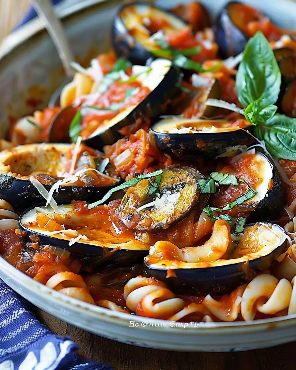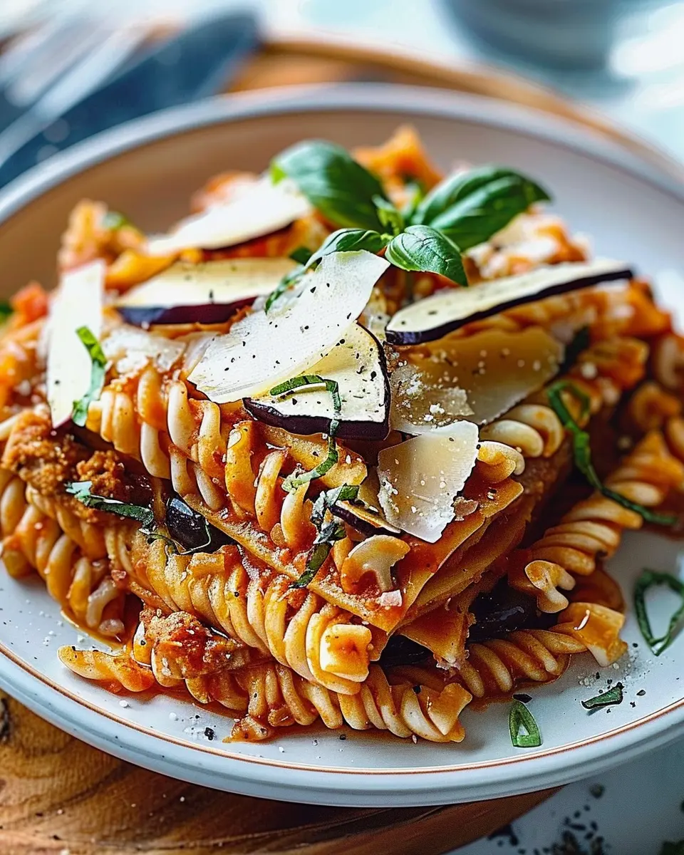 - Top with Sauce: Spoon extra sauce over the top, then arrange the aubergine slices artfully around the pasta.