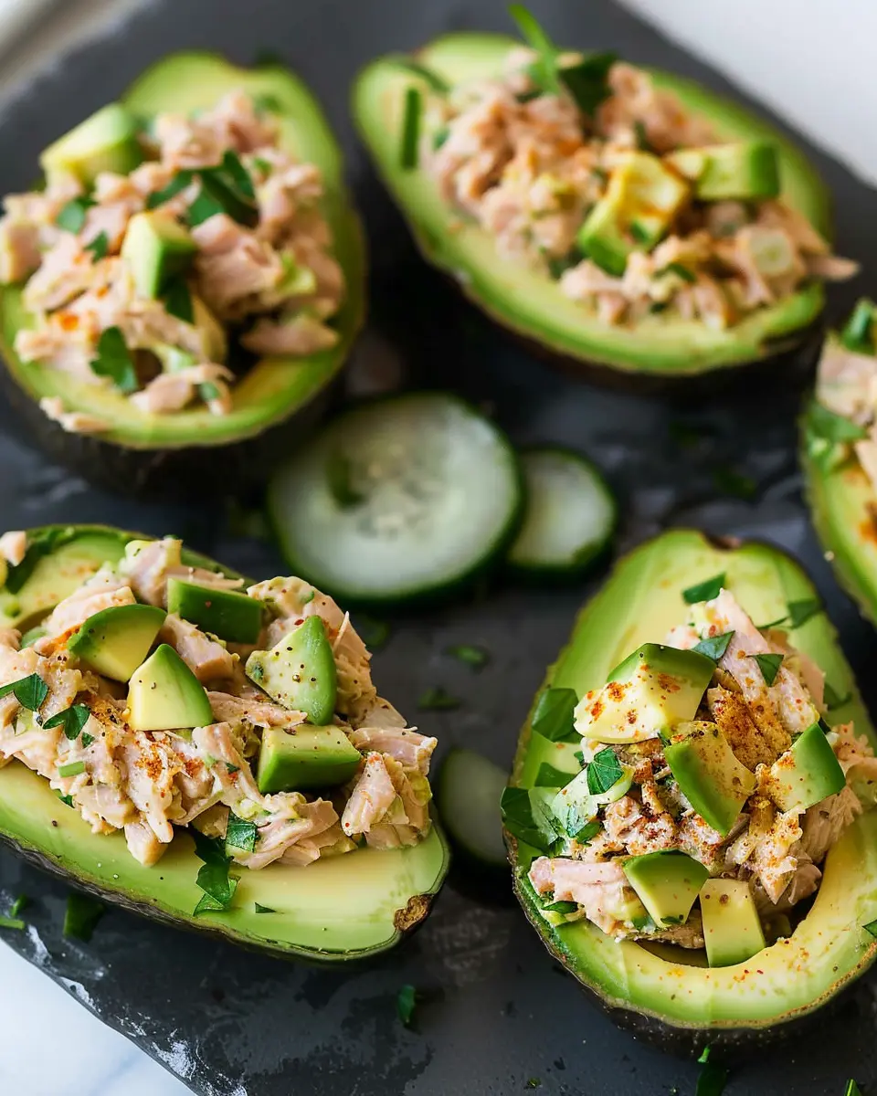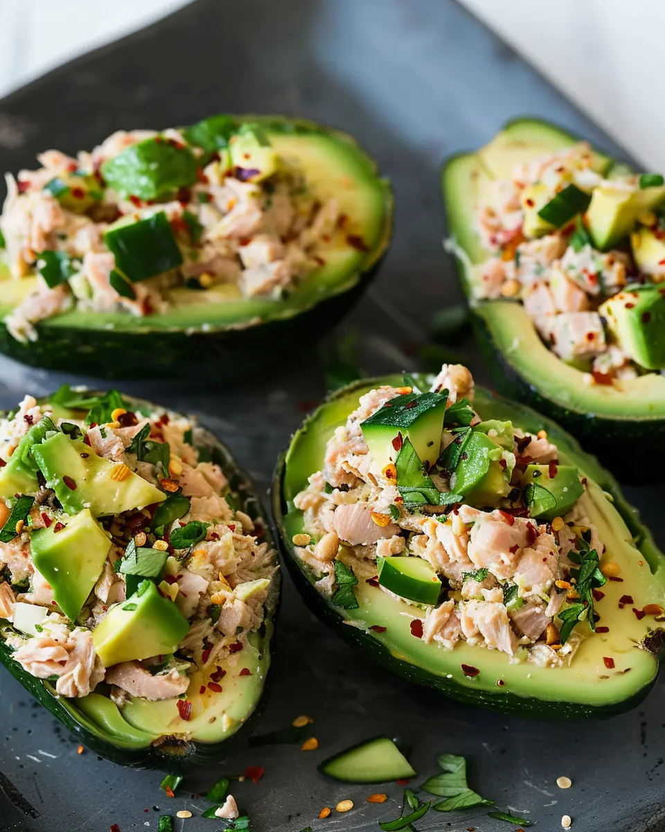 If you love a kick, then spicy tuna stuffed avocados are your go-to option. Start with your basic tuna salad mix, then add a splash of sriracha or chopped jalapeƱos for heat. You can also mix in diced red onion and a squeeze of lime juice to elevate the flavors. Serve these spicy bites with a side of cucumber slices to cool off the palate. The combination of creamy avocado and spicy tuna is irresistible!