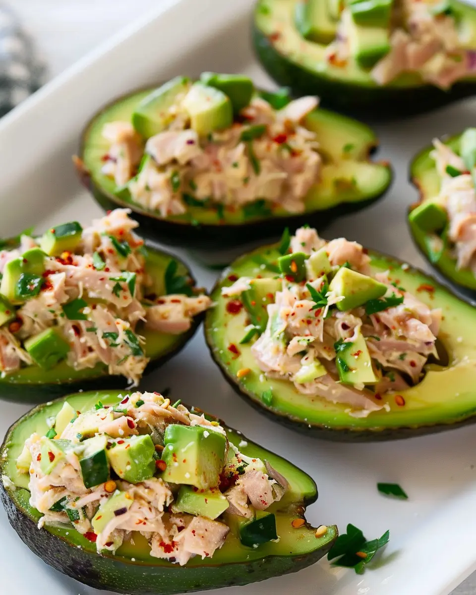 Each serving of tuna stuffed avocados clocks in around 300 calories, making it a satisfying yet light option perfect for lunch or dinner.